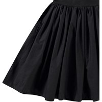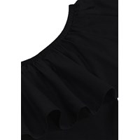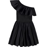 Schwarzes One-Shoulder-Kleid aus weicher Öko-Baumwolle mit eng anliegendem geripptem Oberteil und einem knielangen, kreisförmigen leichten Baumwoll-Popeline-Rock, der Volumen und Bewegung verleiht. Entlang des Ausschnitts verläuft eine breite Popeline-Rüsche, die dem Kleid einen verspielten und femininen Ausdruck verleiht.
