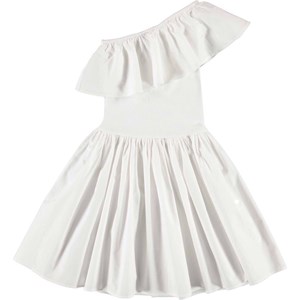 Chloey ist ein weißes One-Shoulder-Kleid mit Rüschen und rund geschnittenem Rock aus Öko-Baumwolle. Das Oberteil ist aus geripptem Jersey mit Rüschen aus Baumwollpopeline, während der Rock ebenfalls aus Baumwollpopeline ist. Der Rock ist in der Taille gerafft, was für einen voluminösen Effekt und viel Bewegungsfreedom sorgt. Schön sowohl für den Alltag als auch für Partys.
