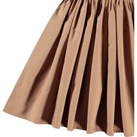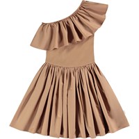 Leicht braunes One-Shoulder-Kleid aus Öko-Baumwolle. Das Kleid verfügt über eine breite Popeline-Rüsche entlang des Ausschnitts, ein eng anliegendes geripptes Oberteil und einen voluminösen Rock mit einem knielangen, kreisförmig geschnittenen Rock.