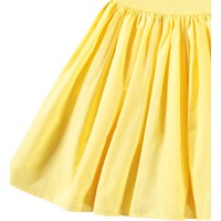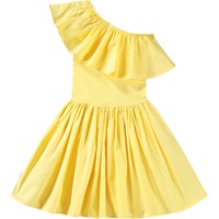 Gelbes One-Shoulder-Kleid aus Öko-Baumwolle. Das Kleid verfügt über eine breite Popeline-Rüsche entlang des Ausschnitts, ein eng anliegendes geripptes Oberteil und einen voluminösen Rock mit knielangem, kreisförmig geschnittenem Rock.