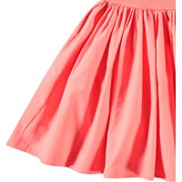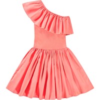 Korallenfarbenes One-Shoulder-Kleid aus Öko-Baumwolle. Das Kleid verfügt über eine breite Popeline-Rüsche entlang des Ausschnitts, ein enganliegendes geripptes Oberteil und einen voluminösen Rock mit knielangem, kreisförmig geschnittenem Rock.