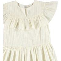 Cho ist ein weißes Kleid mit Metallic-Streifen. Das Kleid hat eine Rüsche über der Brust, die sich bis zu den Schultern fortsetzt und die Ärmel bildet. Außerdem hat das Kleid einen Rock mit Volumen und Rüschen unten.