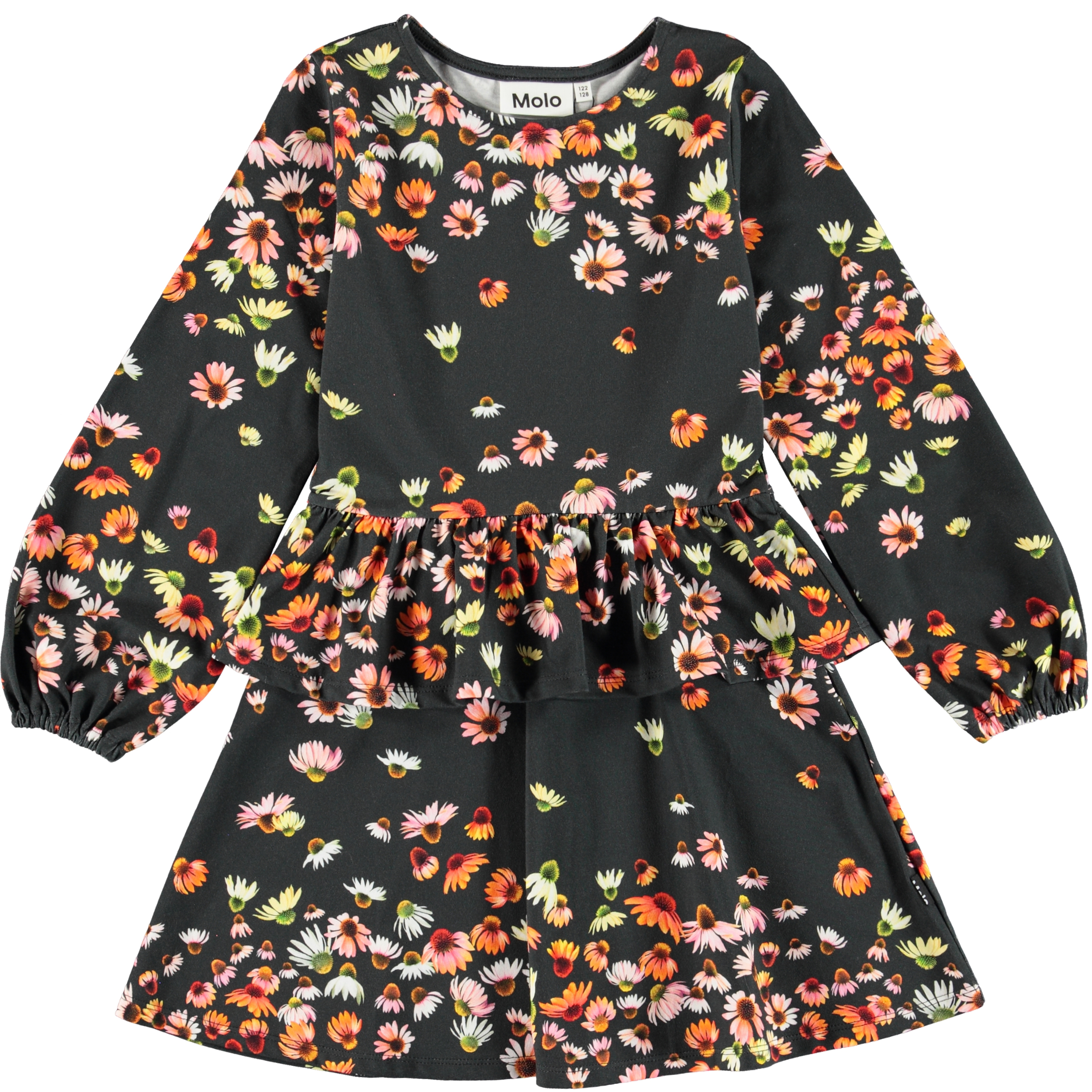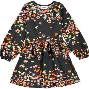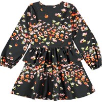 Christabelle ist ein langärmliges schwarzes Kleid mit kleinen Blumen bedruckt. Das Kleid hat einen Schößchenrock an den Taillenärmeln mit etwas Weite.