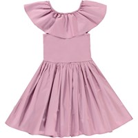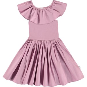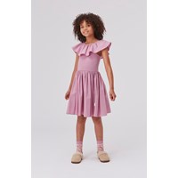 Christal ist ein Helllillas ärmelloses Kleid, bei dem das Oberteil aus Rippstrick mit einem großen Rüschenkragen ist. Der Rock des Kleides ist aus Popeline, die ein schönes Volumen hat.