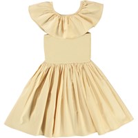 Christal ist ein hellgelbes ärmelloses Kleid, bei dem das Oberteil in Rippstrick mit einem großen Rüschenkragen ist. Der Rock des Kleides ist aus Popeline, die ein schönes Volumen hat.