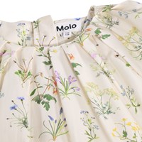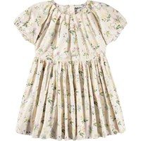 Off-weißes Kleid aus weicher, ökologischer Baumwolle mit kleinen Puffärmeln und feinen Falten um den Halsausschnitt. Ein unsichtbarer Reißverschluss am Rücken erleichtert das An- und Ausziehen. Der Rock ist reich an Falten, was zusätzliche Fülle und einen leichten, luftigen Look verleiht. Das Kleid ist mit einem bunten Blumenmuster verziert, das Leben und ein Sommergefühl hinzufügt.