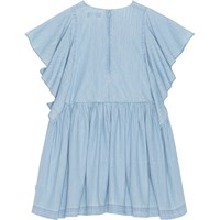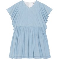 Hellblaues, voluminöses Kurzarmkleid aus Baumwoll-Chambray. Weite Schmetterlingsärmel, lockere Passform und Reißverschluss in der Mitte des Rückens.