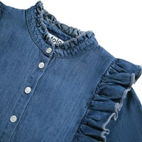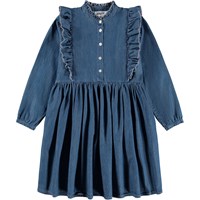 Langärmeliges blaues Kleid aus Öko-Baumwoll-Chambray. Das Kleid hat Rüschenkanten, die vorne, über die Schultern und hinten verlaufen, sowie einen kleinen Stehkragen. Die Ärmel haben Knopfverschlüsse an den Manschetten und das Kleid hat einen Knopfverschluss vorne, um das Anziehen zu erleichtern.