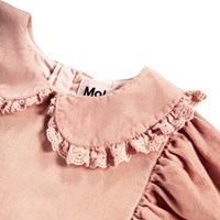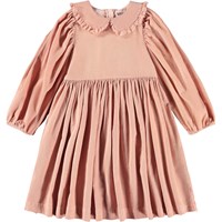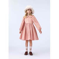 Rosenfarbenes knielanges Kleid aus Öko-Velvet mit langen Ärmeln. Das Kleid hat einen runden Ausschnitt, einen runden Kragen mit Spitzenbesatz, einen Rock mit viel Volumen und ist in einer übergroßen Passform. Die Ärmel haben elastische Bündchen, was für viel Volumen sorgt.