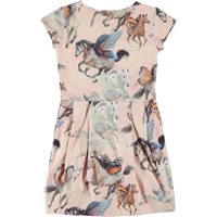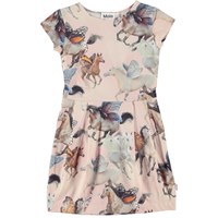 Cia ist ein puderfarbenes Kleid aus Öko-Baumwolljersey. Das Kleid hat kurze Ärmel und Falten im Rock vorne und hinten. Das Kleid hat einen Allover-Print, Fairy Horses, mit galoppierenden Pferden mit Schmetterlingsflügeln.