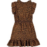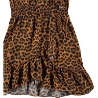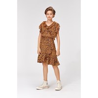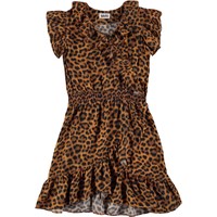 Cilicia ist ein Kleid im Leopardenmuster. Das Kleid hat einen Wickeleffekt mit Rüschenkanten. Außerdem hat das Kleid einen elastischen Bund und kurze Ärmel.