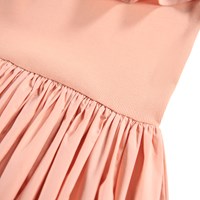 Rosa knielanges Kleid aus Öko-Baumwolle mit einem figurbetonten Jersey-Oberteil und einem voluminösen Rock aus Baumwollpopeline. Das Kleid hat lange Ärmel und einen großen Popeline-Kragen, der auch schulterfrei getragen werden kann.