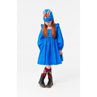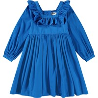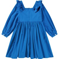 Blaues knielanges Kleid aus Bio-Baumwolle. Das Kleid hat einen quadratischen Ausschnitt mit einem schönen breiten Rüschenbesatz. Die langen Ärmel sind voluminös und haben einen feinen Knopfverschluss und Saumband. Der Rock ist mit Falten genäht, die sowohl Volumen als auch Leichtigkeit verleihen. Auf der Rückseite hat das Kleid einen unsichtbaren Reißverschluss, der das Anziehen erleichtert.