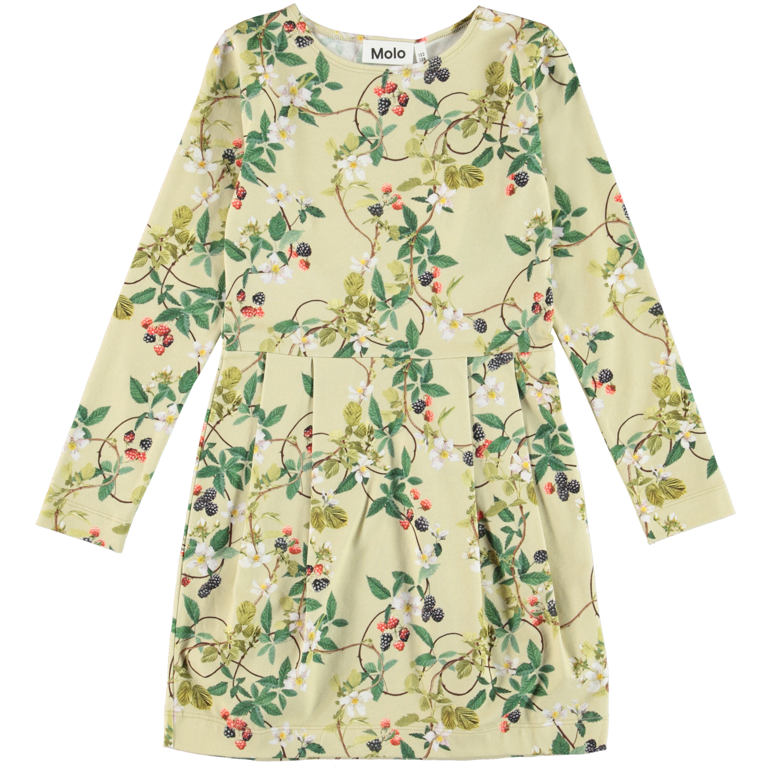Cindarell ist ein hellgrünes Kleid mit langen Ärmeln und einem Aufdruck aus feinen Brombeerranken. Das Kleid hat lange Ärmel und eine Form, die dem Körper folgt, ohne tailliert und eng zu sein.