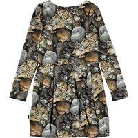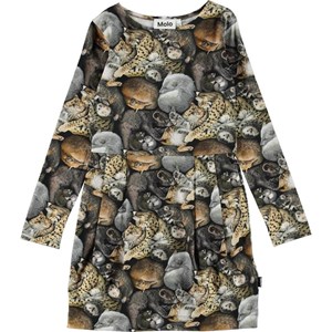Cindarell ist ein langärmliges Kleid mit Aufdrucken verschiedener Tiere, die sich zusammengerollt haben und tief schlafen. Das Kleid hat lange Ärmel und eine Form, die dem Körper folgt, ohne tailliert und eng zu sein.