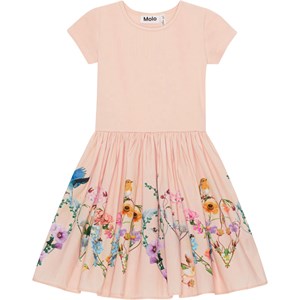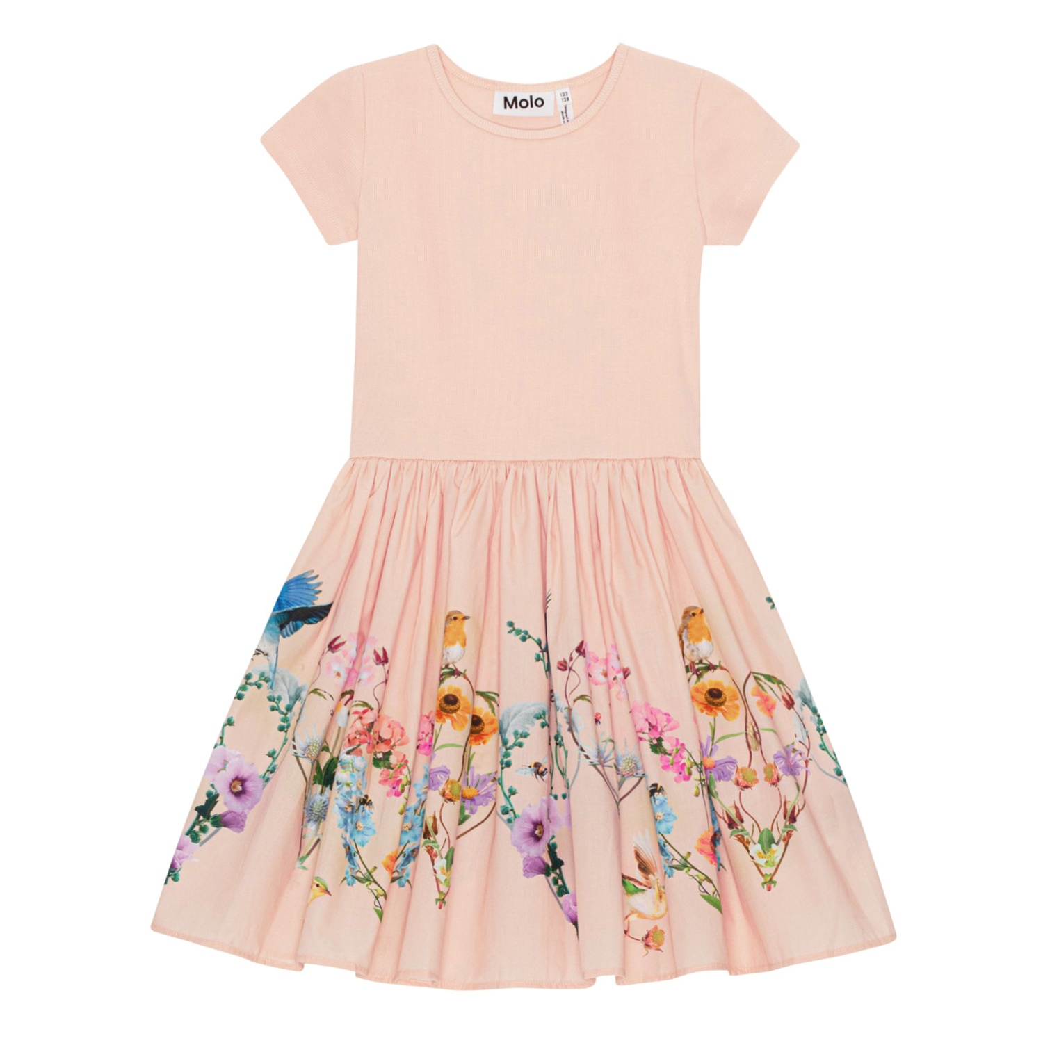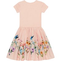 Puderfarbenes Kurzarmkleid mit rund geschnittenem Rock aus Öko-Baumwolle. Das Oberteil besteht aus geripptem Jersey und ist eng anliegend, während der Rock aus Baumwollpopeline mit einem mehrfarbigen Aufdruck aus Vögeln und wilden Sommerblumen besteht.
