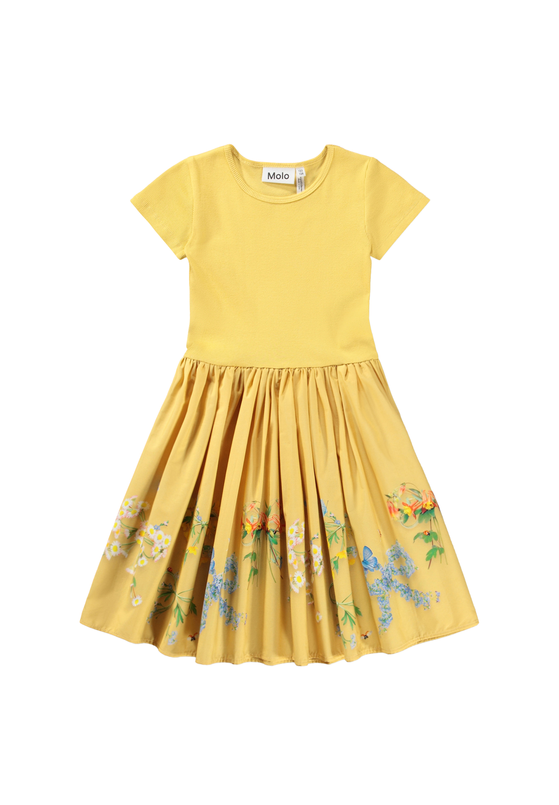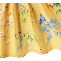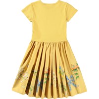 Gelbes kurzärmeliges Kleid aus weicher Öko-Baumwolle. Das Oberteil hat eine enge Passform aus geripptem Jersey, und der weiche Popelinrock hat einen niedlichen Druck von Pflanzen und Blumen in Form kleiner Schleifen. Es ist ein bequemes und festliches Kleid mit viel Bewegungsfreiheit.
