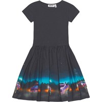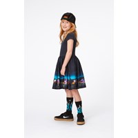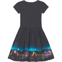 Schwarzes Kurzarmkleid mit rund geschnittenem Rock aus Öko-Baumwolle. Das Oberteil besteht aus geripptem Jersey und ist figurbetont, während der Rock aus Baumwollpopeline mit einem Aufdruck von Autos mit Flammen darauf im Dunkeln der Nacht besteht.