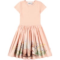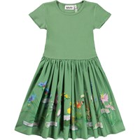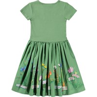Grünes kurzärmeliges Kleid aus weicher Öko-Baumwolle. Das Oberteil hat eine enge Passform aus geripptem Jersey, und der weiche Poplin-Rock hat einen süßen Druck von Pflanzen und Sommerblumen. Es ist ein bequemes und festliches Kleid mit viel Bewegungsfreiheit.