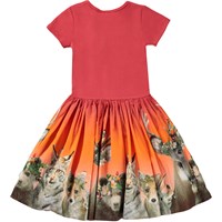 Cissa ist ein zweiteiliges rotes Kleid mit einem kurzärmligen, gerippten Oberteil. Der Rock ist mit Drucken von verschiedenen Tieren.