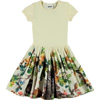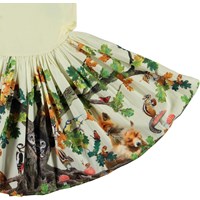 Cissa ist ein zweiteiliges hellgelbes Kleid mit einem kurzärmeligen, gerippten Oberteil. Der Rock ist mit Aufdruck des Waldes und seiner vielen verschiedenen Tiere.