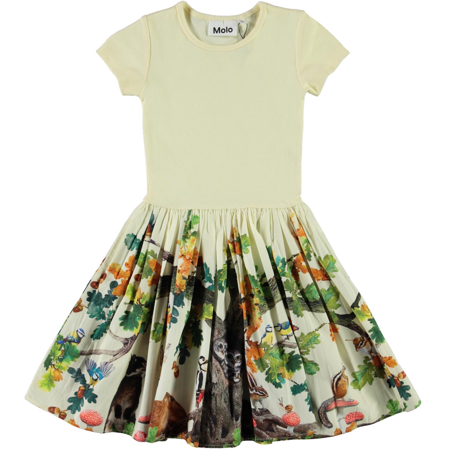 Cissa ist ein zweiteiliges hellgelbes Kleid mit einem kurzärmeligen, gerippten Oberteil. Der Rock ist mit Aufdruck des Waldes und seiner vielen verschiedenen Tiere.