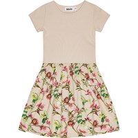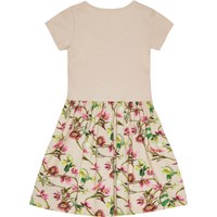 Beiges kurzärmeliges Kleid aus Öko-Baumwolle mit einem eng anliegenden gerippten Jersey-Oberteil und einem glatten Jersey-Rock. Das Kleid hat einen unsichtbaren Reißverschluss auf der Rückseite und einen bezaubernden Druck von Blumen und Vögeln in passenden Farben.