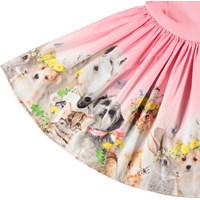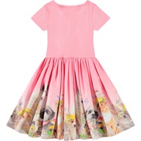 Rosa kurzärmeliges Kleid aus Öko-Baumwolle mit einem eng anliegenden gerippten Jersey-Oberteil und einem Popeline-Rock. Das Kleid hat eine normale Passform mit einem Druck auf dem Rock von niedlichen Tieren mit Blumenkränzen auf ihren Köpfen.