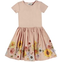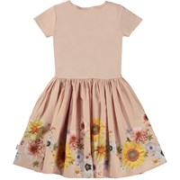 Rosa knielanges kurzärmliges Kleid mit Rock aus Popeline mit Blumendruck. Der Druck zeigt unter anderem Blumen wie Sonnenblumen und Dahlien. Dieses Kleid besteht aus 100% Baumwolle, hat einen Rundhalsausschnitt, kurze Ärmel, einen Popeline-Rock mit viel Volumen und eine schmale Passform.