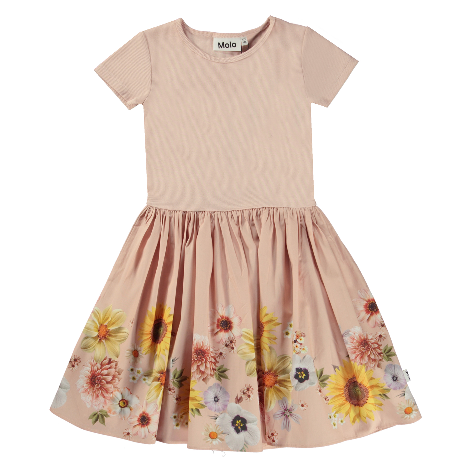 Rosa knielanges kurzärmliges Kleid mit Rock aus Popeline mit Blumendruck. Der Druck zeigt unter anderem Blumen wie Sonnenblumen und Dahlien. Dieses Kleid besteht aus 100% Baumwolle, hat einen Rundhalsausschnitt, kurze Ärmel, einen Popeline-Rock mit viel Volumen und eine schmale Passform.