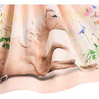 Pfirsichfarbenes kurzärmeliges Kleid aus weicher Öko-Baumwolle. Das Oberteil hat eine enge Passform aus geripptem Jersey, und der weiche Poplinrock hat einen bezaubernden Druck eines Pferdes zwischen bunten Blumen. Es ist ein bequemes und festliches Kleid mit viel Bewegungsfreiheit.
