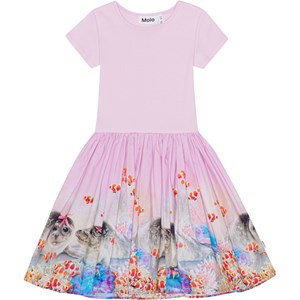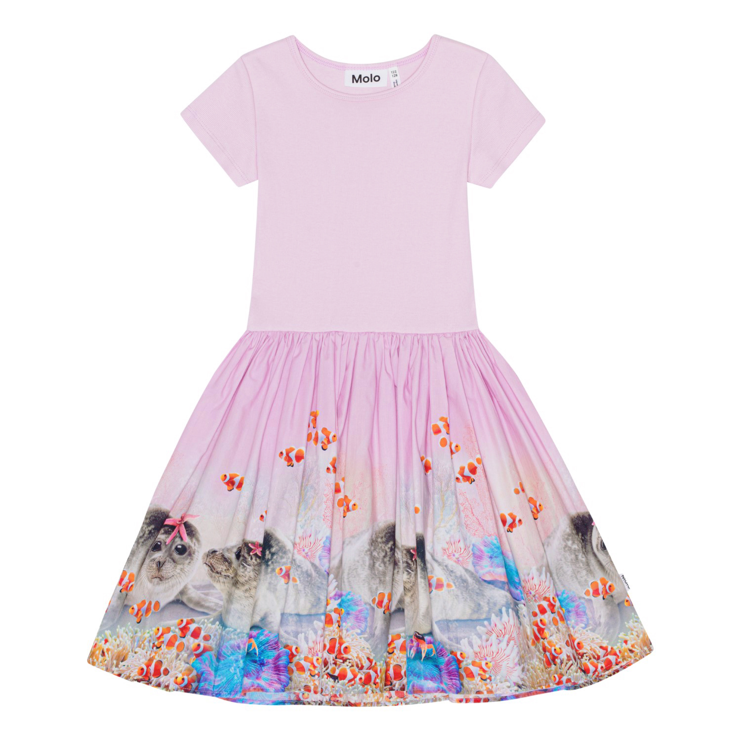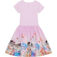 Rosafarbenes Kurzarmkleid mit rund geschnittenem Rock aus Öko-Baumwolle. Das Oberteil ist aus geripptem Jersey und sitzt eng anliegend, während der Rock aus Baumwollpopeline mit einem Aufdruck von Babyrobben und Nemofisk in einem fantasievollen Korallenriff besteht.