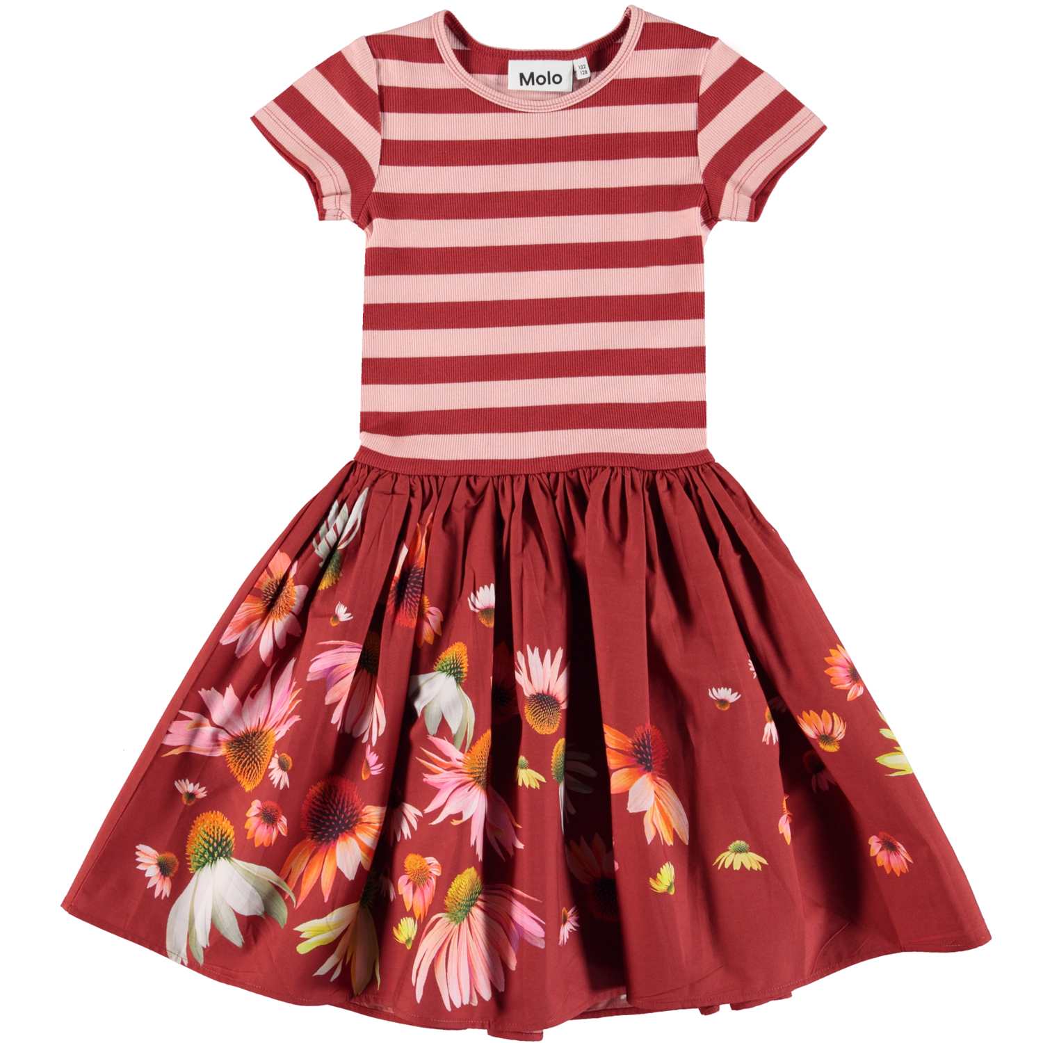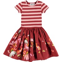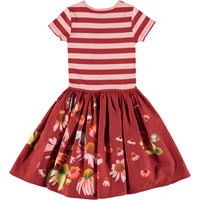 Cissa ist ein zweiteiliges Kleid mit einem kurzärmligen, gestreiften Oberteil in Rot und Pink. Der Rock ist mit einem Aufdruck von Wildblumen.