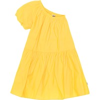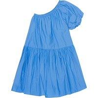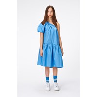 Blaues One-Shoulder-Kleid aus Öko-Baumwolle. Der obere Teil des Kleides hat einen schrägen Schnitt, ist elastisch und hat auf der rechten Seite einen T-Shirt-Puffärmel. Das Kleid ist knielang, hat viele Rüschen, die ihm ein schönes Volumen verleihen und das Anziehen und den Tragekomfort erleichtern.