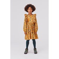 Clea ist ein goldenes Kleid mit Prints von feinen Brombeerranken. Das Kleid hat Rüschenkanten auf der Vorderseite und einen Reißverschluss am Hals.