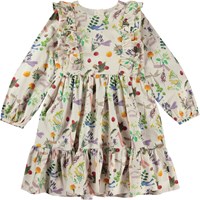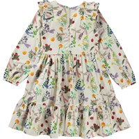 Clea ist ein weißes Kleid mit Stretch aus Öko-Baumwolle. Das Kleid ist knielang mit langen Ärmeln, einem voluminösen Saum und einem verdeckten Reißverschluss auf der Rückseite. Auf der Brust hat das Kleid auf jeder Seite zwei Rüschenreihen, die beide gerade nach oben und über die Schulter gehen. Das Kleid hat einen Allover-Print, Plant Dye White, der verschiedene Blumen und Beeren zeigt und welche Farben daraus entstehen können.