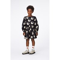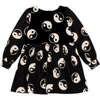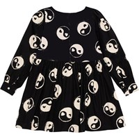 Schwarzes knielanges Kleid aus Öko-Baumwolle. Das Kleid hat einen Rundhalsausschnitt, lange Ärmel mit Manschettenverschluss und einen unsichtbaren Reißverschluss auf der Rückseite, der das Anziehen erleichtert. Das Kleid ist locker und an der Taille gerafft, was dem Rock ein schönes Volumen verleiht. Der Aufdruck auf dem Kleid ist ein Allover-Aufdruck aus schwarz-weißen Yin- und Yang-Zeichen.
