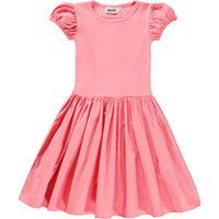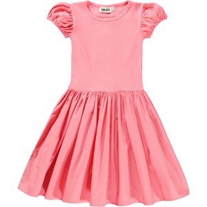 Kurzärmliges korallenfarbenes Kleid mit rund geschnittenem Rock aus Öko-Baumwolle. Das Oberteil ist aus enganliegendem Jersey gefertigt, wodurch es leicht anzuziehen und angenehm zu tragen ist. Das Kleid hat einen Rundhalsausschnitt und kleine Puffärmel mit Gummizug unten. Der Rock besteht aus der gleichen Baumwollpopeline wie die Ärmel und sorgt für ein schönes Volumen.