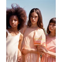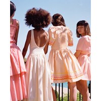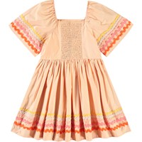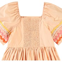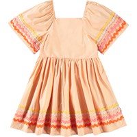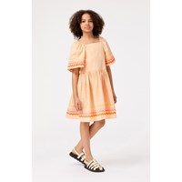 Knielanges orangefarbenes Kleid aus Öko-Baumwolle mit weiten Schmetterlingsärmeln. Das Kleid hat eine normale Passform, einen quadratischen Ausschnitt, einen elastischen Rand über den Schultern und einen Rüschen-Effekt im Rücken, der das An- und Ausziehen erleichtert. Das Kleid ist mit bunten Bändern an den Ärmeln und am unteren Saum verziert.