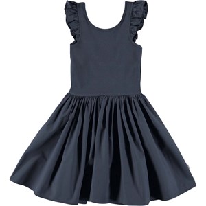 Cloudia ist ein dunkelblaues ärmelloses Kleid, bei dem das Oberteil aus Rippstrick mit kleinen Rüschenkanten an den Schultern besteht. Der Rock des Kleides ist aus Popeline, die ein schönes Volumen hat.