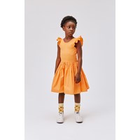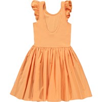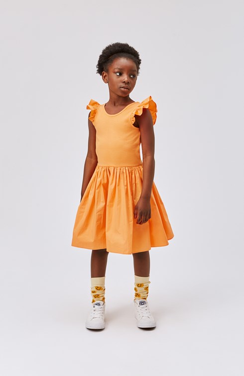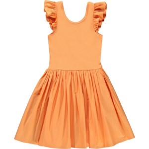 Cloudia ist ein orangefarbenes, knielanges Kleid aus Öko-Baumwolle. Das Kleid hat einen rund geschnittenen Rock und Rüschen an den Schultern aus Popeline. Das Oberteil ist aus Ripp-Jersey und hat einen tieferen Rückenausschnitt.