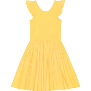 Gelbes knielanges Kleid aus Öko-Baumwolle. Das Kleid hat einen rund geschnittenen Rock und Rüschen an den Schultern aus Popeline. Das Oberteil besteht aus Rippjersey und ist hinten tiefer geschnitten.