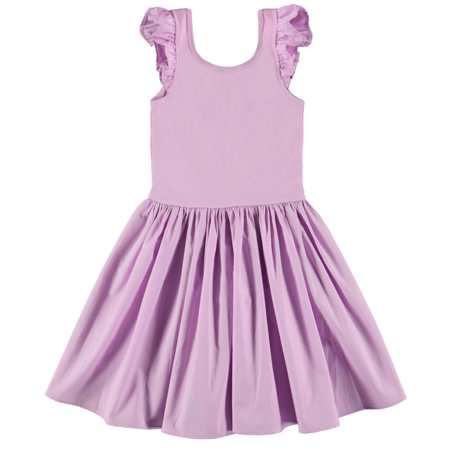 Cloudia ist ein hellviolettes Kleid ohne Ärmel, bei dem das Oberteil in Ripp mit kleinen Rüschenkanten an den Schultern ist. Der Rock des Kleides ist aus Popeline, die ein schönes Volumen hat.