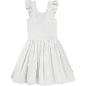 Cloudia ist ein weißes, knielanges Kleid aus Öko-Baumwolle. Das Kleid hat einen rund geschnittenen Rock und Rüschen an den Schultern aus Popeline. Das Oberteil ist aus Ripp-Jersey und hat einen tieferen Rückenausschnitt.