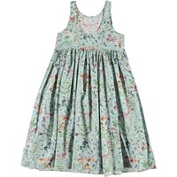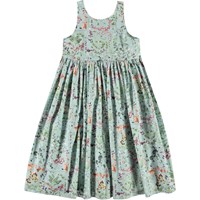 Clover ist ein hellblaues ärmelloses Kleid mit feinem Blumendruck. Das Kleid hat ein schönes Volumen und einen etwas tieferen Rücken.