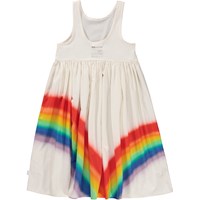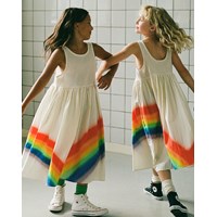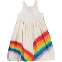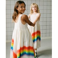 Hier ist das Kleid Clover in Weiß mit einem Regenbogendruck auf dem Rock. Das Kleid ist aus Baumwolle und ärmellos.