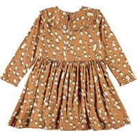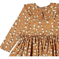 Coco ist ein beiges Kleid mit einem Druck aus weißen Flecken, der wie das Fell eines Hirsches aussieht. Das Kleid hat einen großen schönen Kragen und schließt am Hals mit einem Reißverschluss.