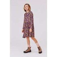 Coco ist ein lila Kleid mit Blättern in wunderschönen Farben. Das Kleid hat einen großen schönen Kragen und einen Reißverschluss am Hals.