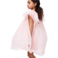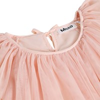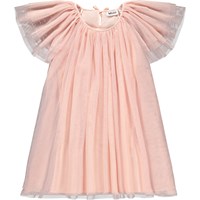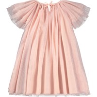 Knielanges Kleid aus hellrosa Tüll mit Falten und leichtem Schwung. Das Kleid hat kurze, transparente Ärmel und eine Schleife am Hals. Es ist ein feines und luftiges Kleid für festliche Anlässe.