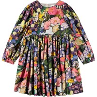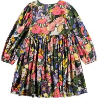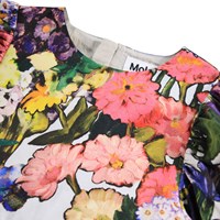 Kurzes Kleid aus Öko-Viskose. Das Kleid hat ein buntes Blumenmuster, einen runden Ausschnitt, ist leicht oversized und hat viele Raffungen an den Ärmeln und am Rock. Die langen Ärmel haben elastische Bündchen, um Volumen zu verleihen. Das Kleid lässt sich leicht mit dem unsichtbaren Reißverschluss auf der Rückseite anziehen.